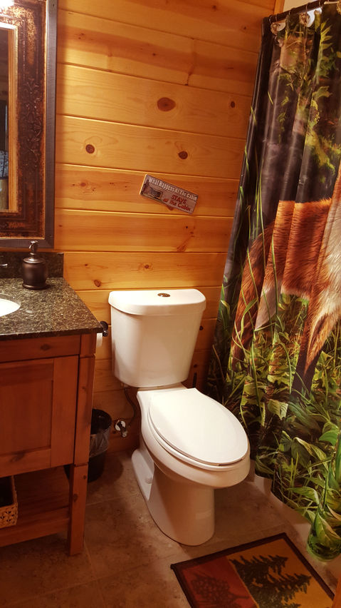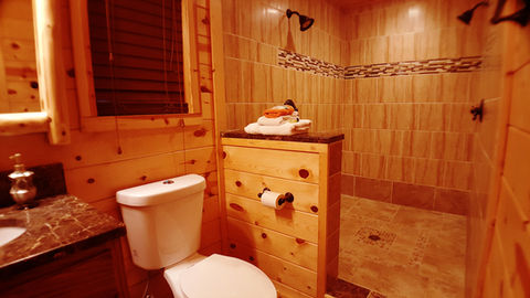 This Cabin has 1 King Bed & 2 Queen in 3 Bedrooms ( all 3 in main floor ) & 1 twin-over-twin bunk bed downstairs in game room. All Bedrooms have attached bathroom. This Cabin has total 3 Full Bath ( in main floor ) & 1 Half Bath in downstairs game room.